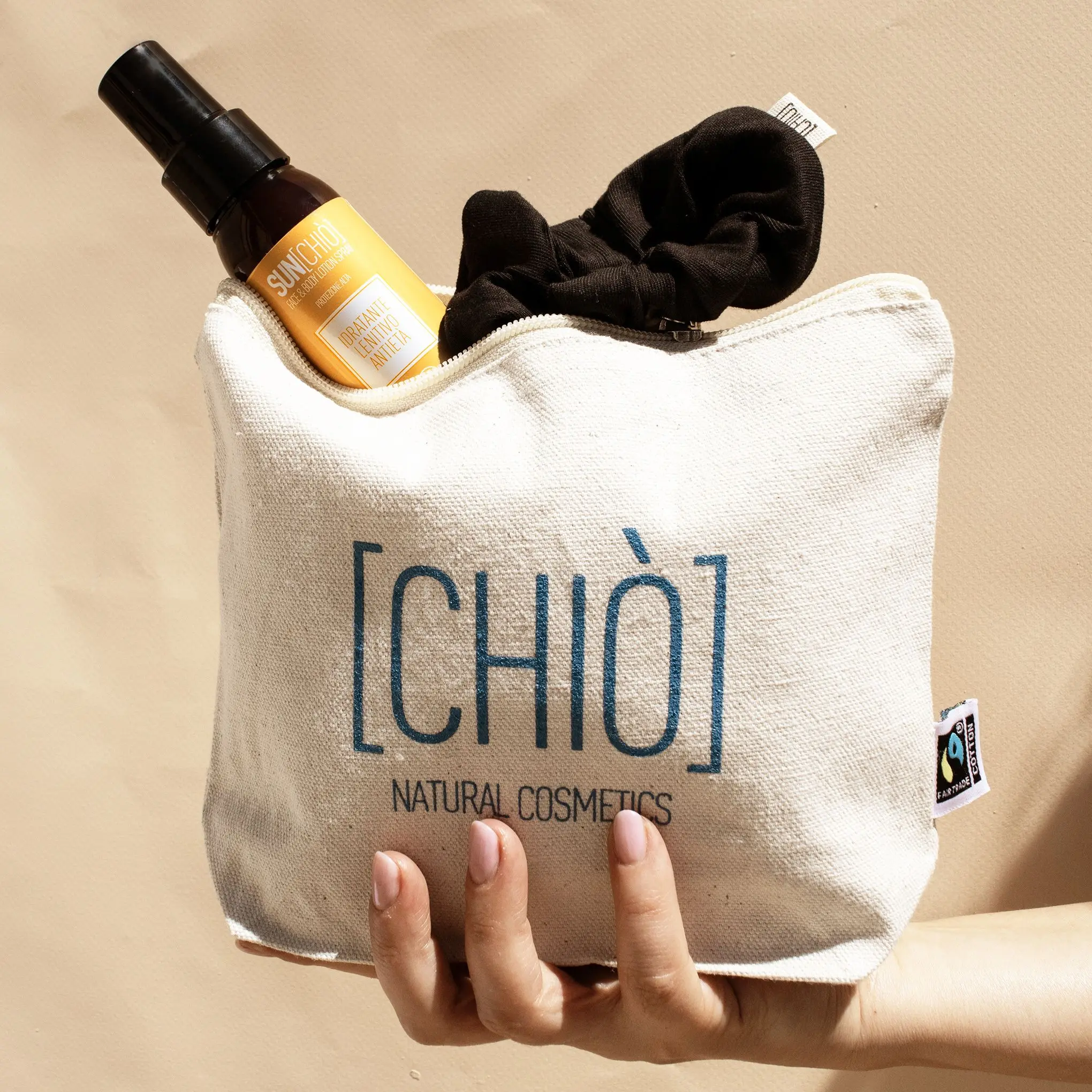 Un kit molto pratico per l’estate, e utilissimo durante il resto dell’anno: terminata la protezione solare potrai sempre riutilizzare la pochette e lo scrunchie: lavabili, ecologici e sostenibili, per l’ambiente e sui capelli.