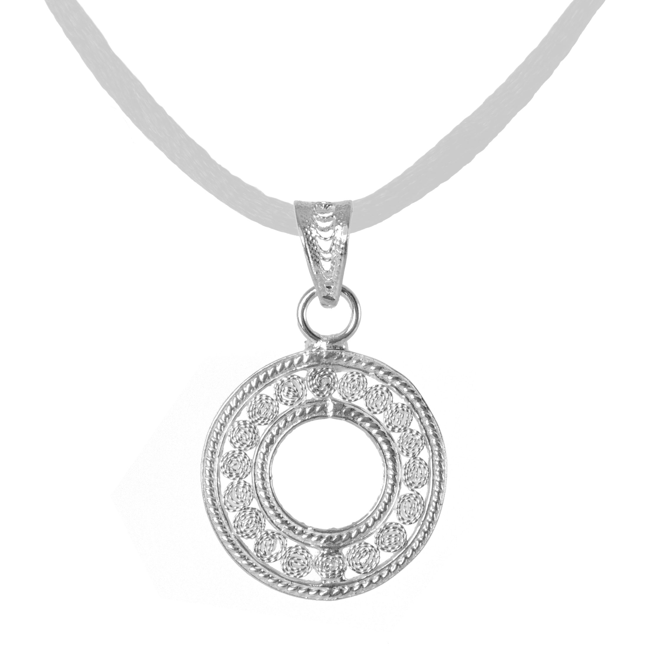Ciondolo in argento 925‰ rodiato, diametro 18 mm lavorazione in filigrana a mano on cordoncino in tessuto bianco perla.