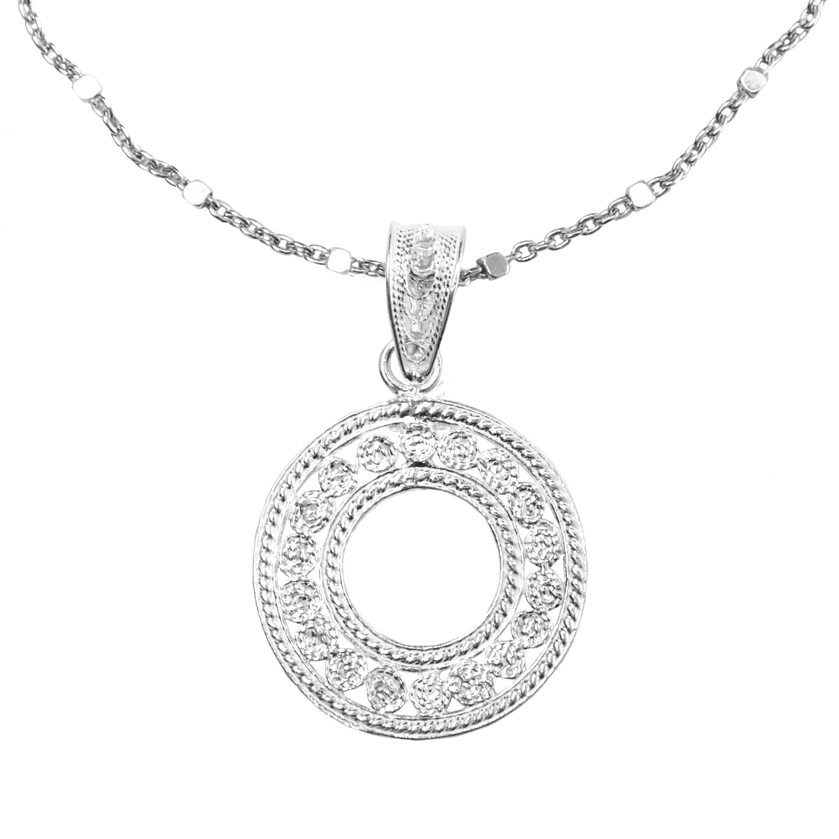 Ciondolo in argento 925‰ rodiato, diametro 18 mm lavorazione in filigrana a mano con catenina da 45 cm o 60 cm in argento con piattine.