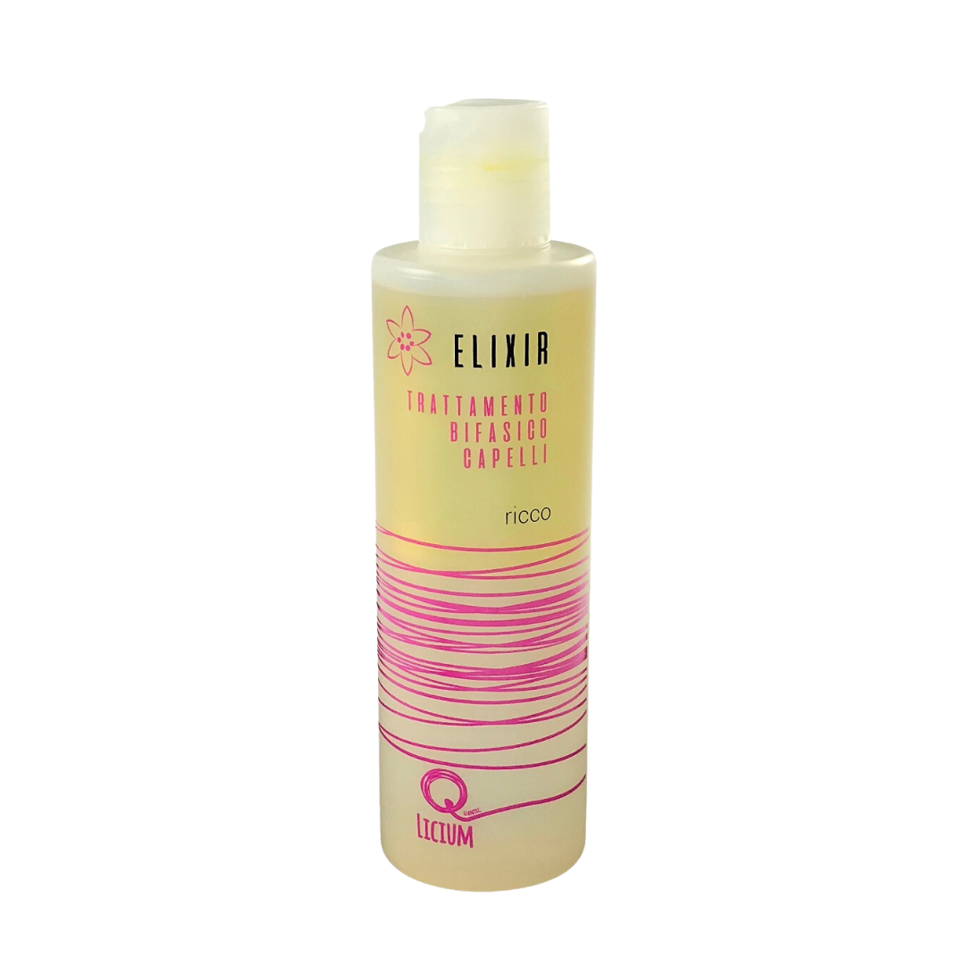 L’elixir trattamento bifasico per capelli dalla texture ricca è formulato con Gel di Acido Ialuronico e Oli di Riso e Ricino.
