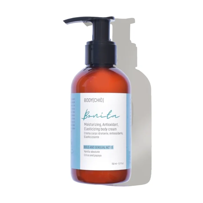 Bonita is a moisturizing, antioxidant, elasticizing body lotion with a dry, velvety touch and a bold, sensual scent that is addictive: gourmand notes of Vanilla Absolute, which plays with citrus and exotic fruits, just enough to give cheerfulness and energy under the control of the warm amber base.